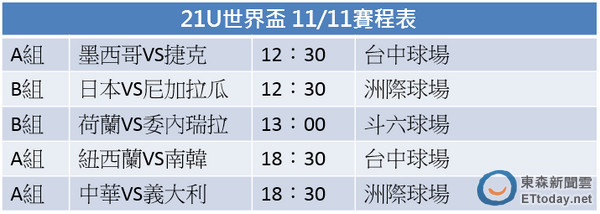 ▲21U世界盃11/11賽程表。(圖/ETtoday東森新聞雲製表)